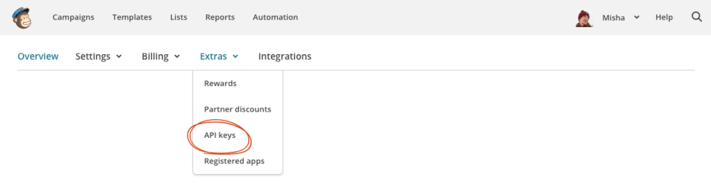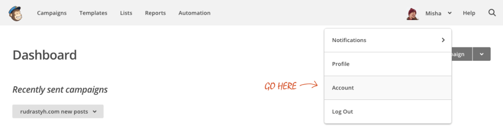 Follow bellow instructions to get a MailChimp API key. In main MailChimp menu click on your picture and go to Account.