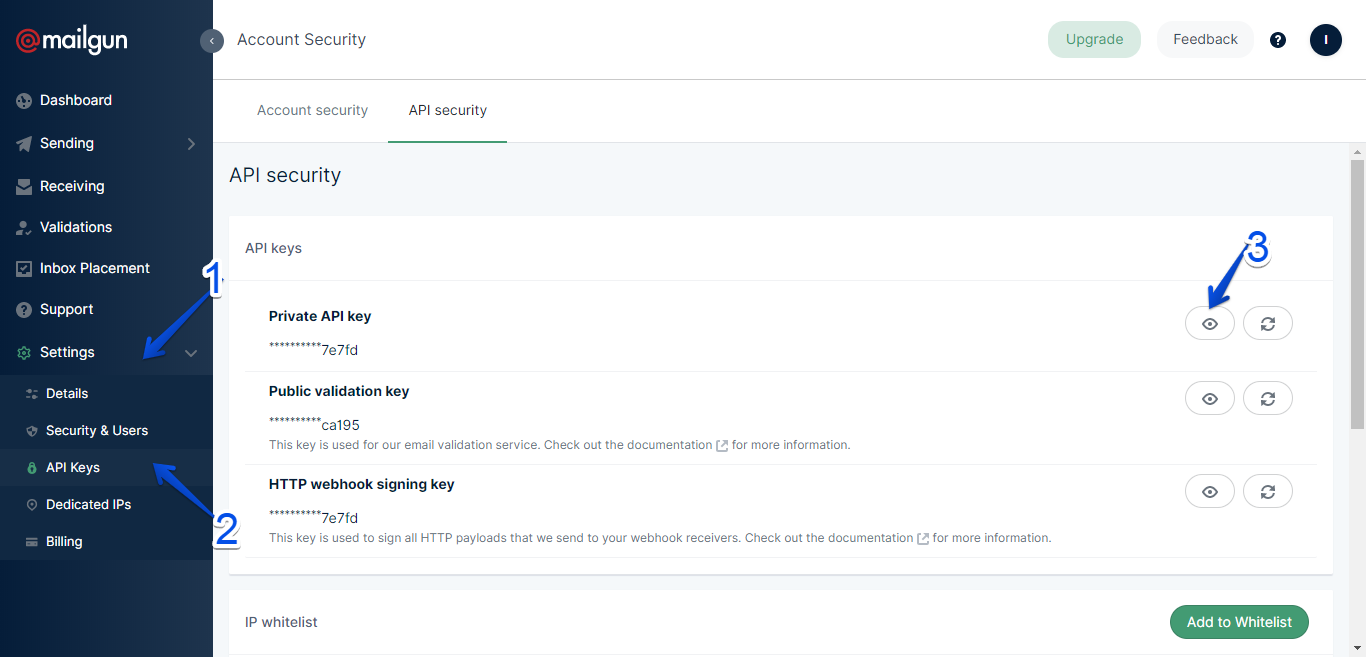 - Click on “Settings” on the left side menu of your the Mailgun dashboard.