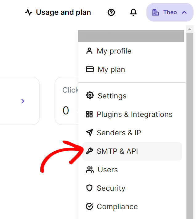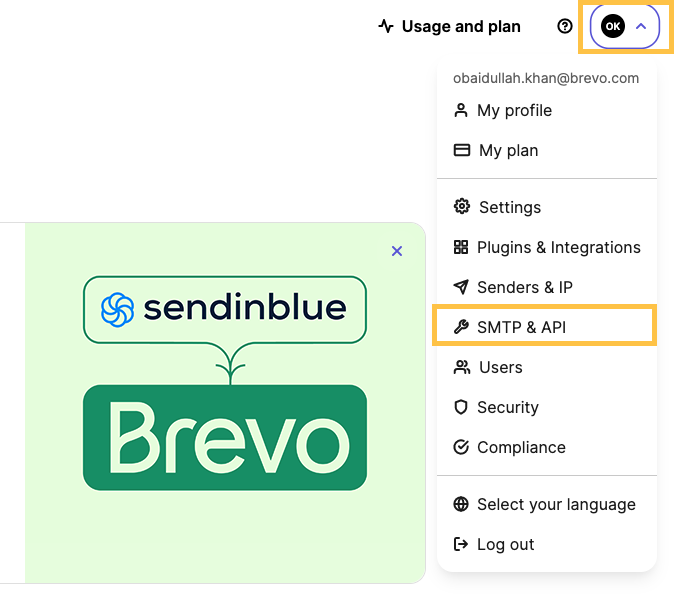 To find your API key, log into your Brevo account, click on the profile name on the top right corner of the page, and then SMTP & API.