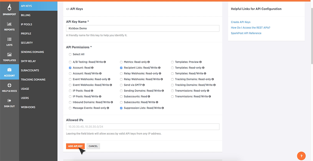 Enter in an “API Key Name” of your choosing; this name is only used internally for your organization’s purposes. Then under “API Permissions”, you will need to check the three following boxes: Account: Read Recipient Lists: Read/Write Suppression Lists: Read/Write Leave Allowed IPs blank and click the orange Add API Key button.