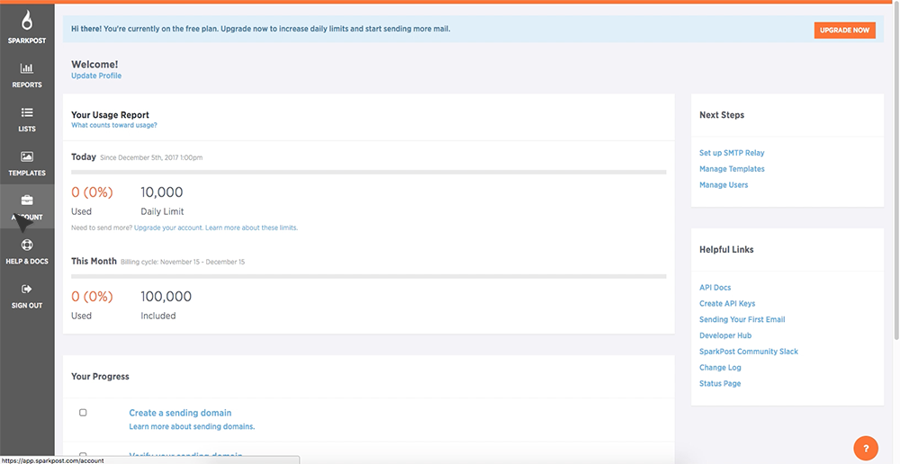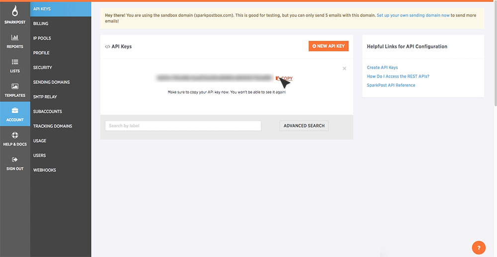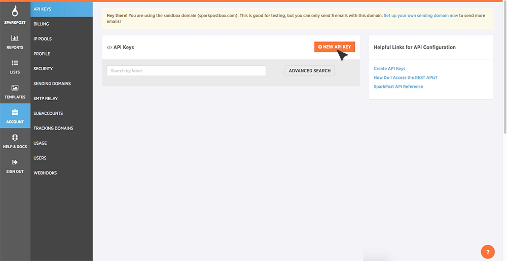 Before you can use the SparkPost REST APIs, you will need to have a valid SparkPost API key. Below are the steps you will need to create a SparkPost API key. Open a browser tab and Log In to your SparkPost account. Click the Account tab in the left-side navigation.