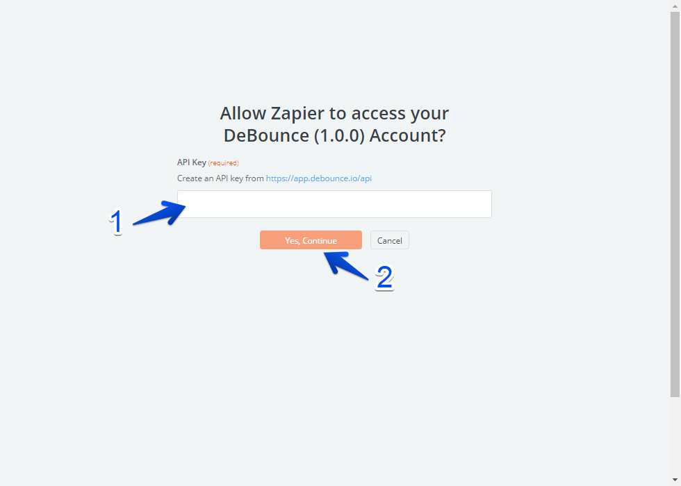 Step 9: Here, the only actionable option will be “Email Validation,” which has been chosen already. Tap “Continue,” followed by “Choose Account.” This will help link your DeBounce account. In the subsequent page, type in your API key – you can generate your API key under the API section in your DeBounce account. Next, select “Yes, Continue.”