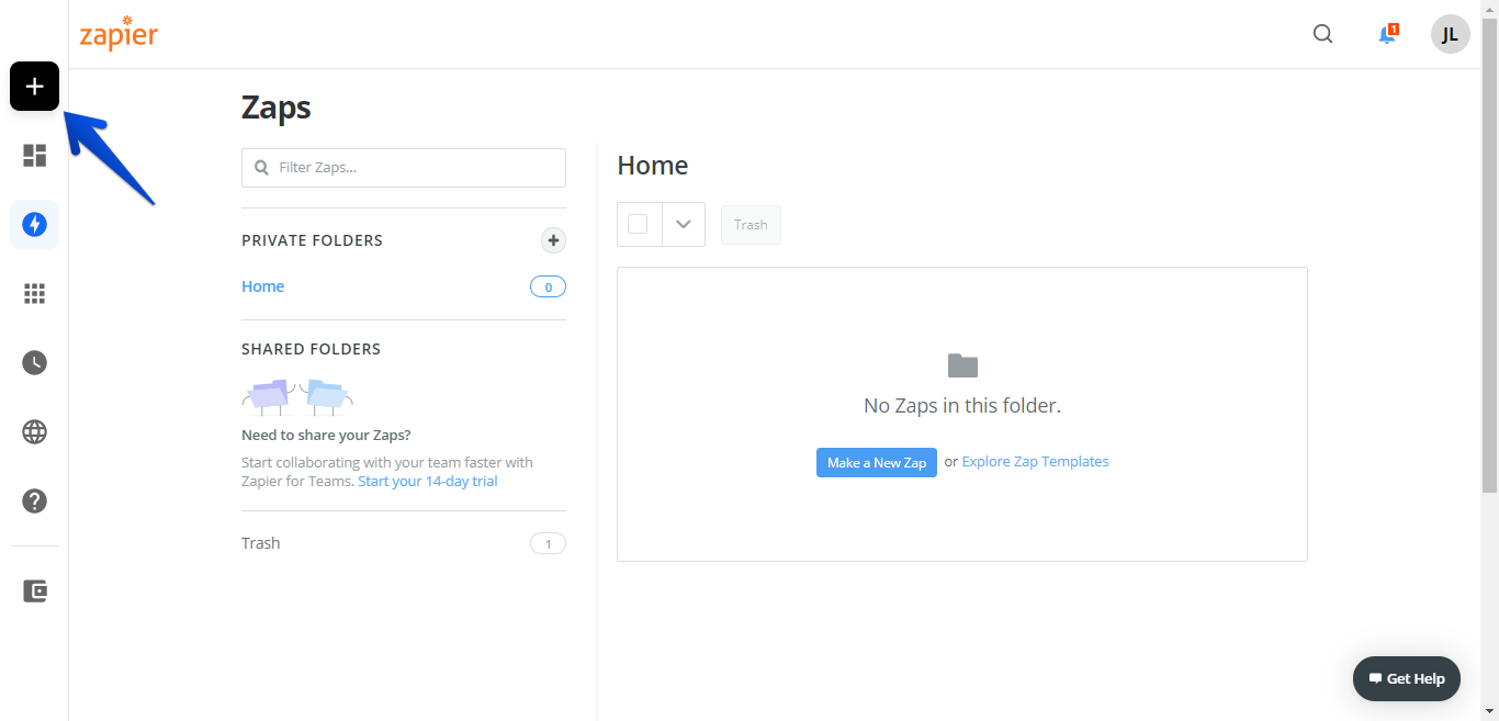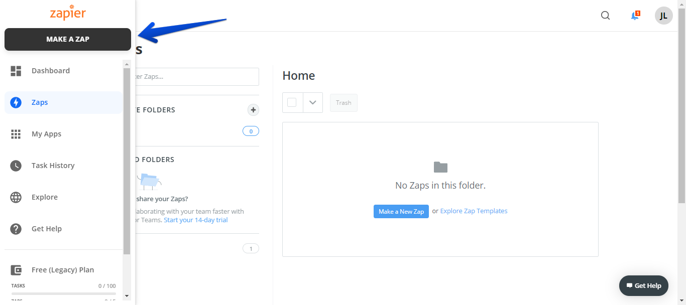 Step 1: Open your Zapier account and log in. At the top-left of the page, tap “+” icon. and then tap “MAKE A ZAP”.