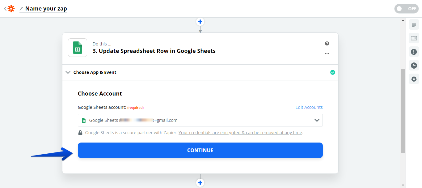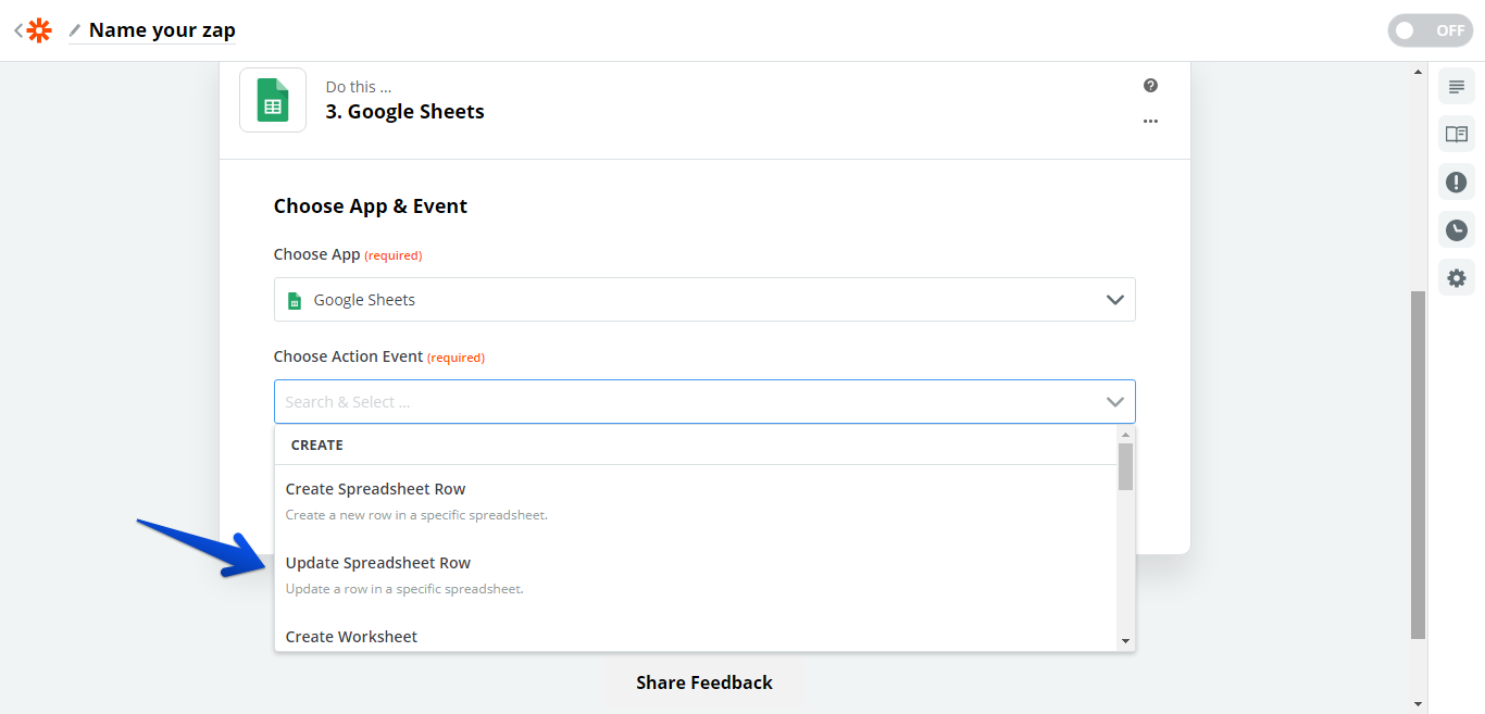 Step 13: Again, you will need to choose an app that will perform the selected action. By now, you will see Google Sheets in your apps. Tap Google Sheets, and click “Update Spreadsheet Row.” Then, tap “Continue.”