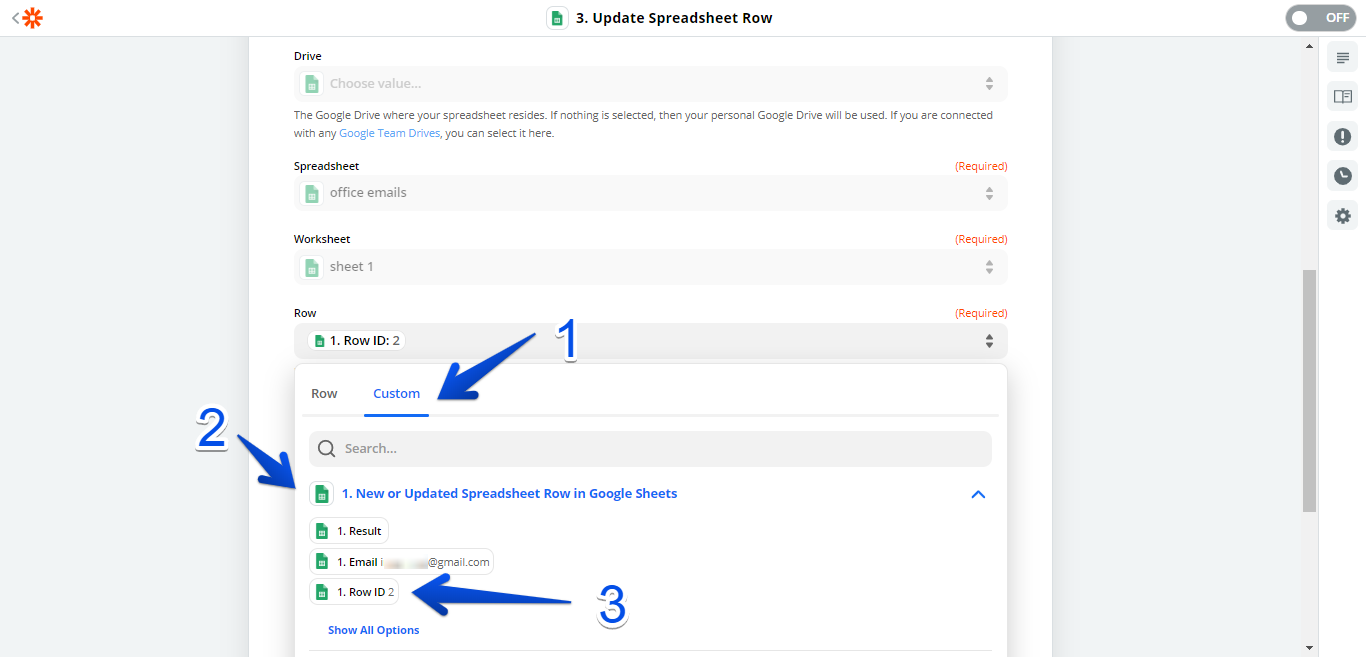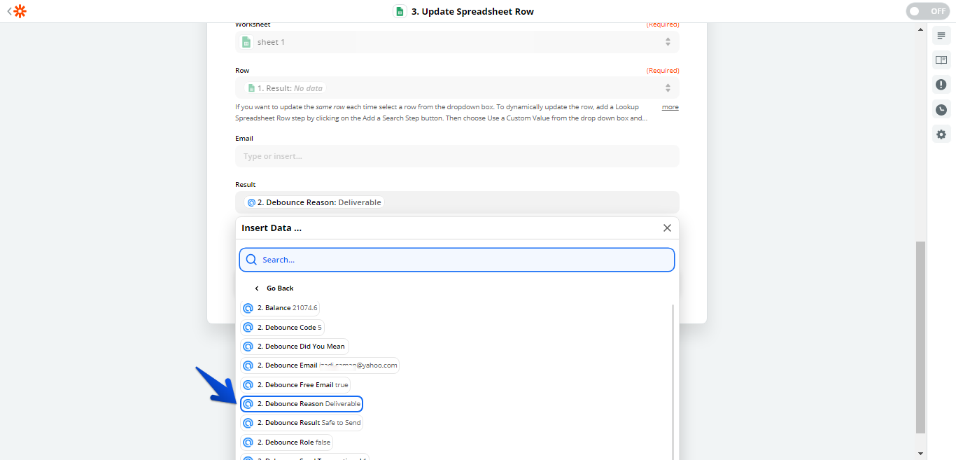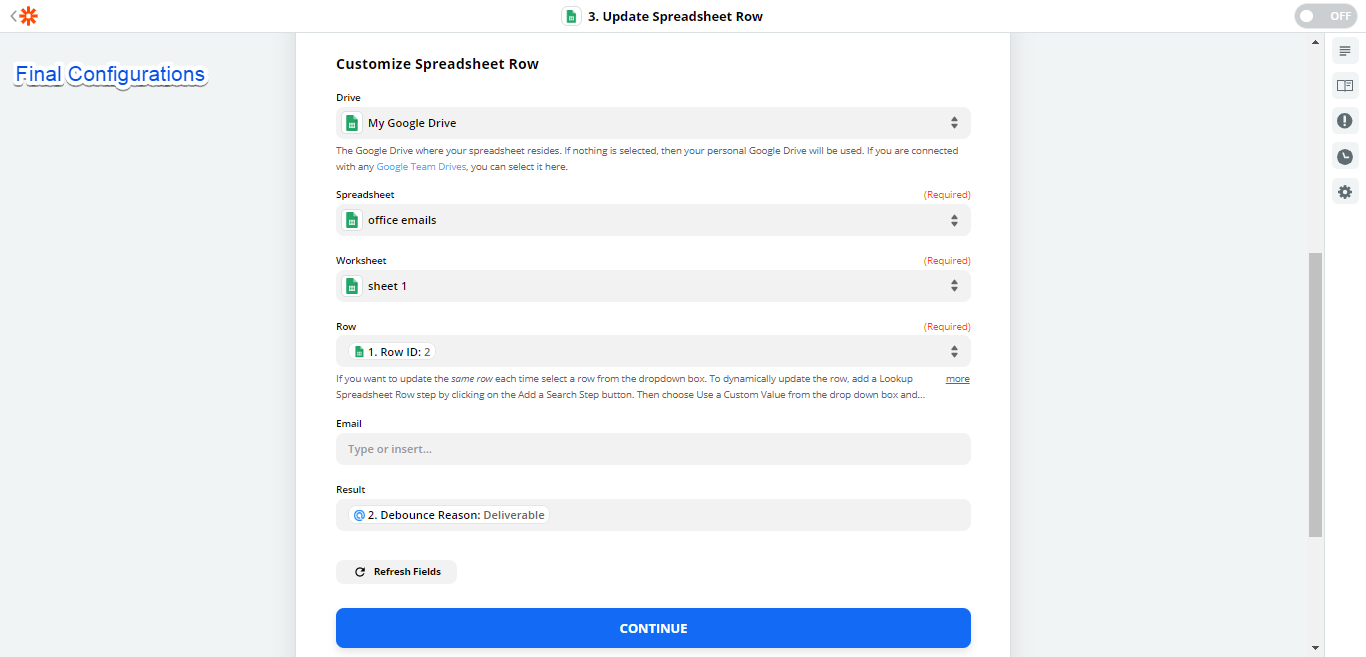 Step 15: Now, as we have explained in step 6, choose the spreadsheet and the worksheet. Afterward, click “Custom” under the Row and tap the drop-down icon under “New or Updated Spreadsheet Row in Google Sheets” and select “Row ID” on the list. Now, scroll down to see the fields which you have developed in your spreadsheets for verification results – remember the Validation Result column which we discussed under “What do you need?” section. From the drop-down menu “Result”, click each field to choose them (your desired validation output – For example DeBounce Reason). Then, tap “Continue.”