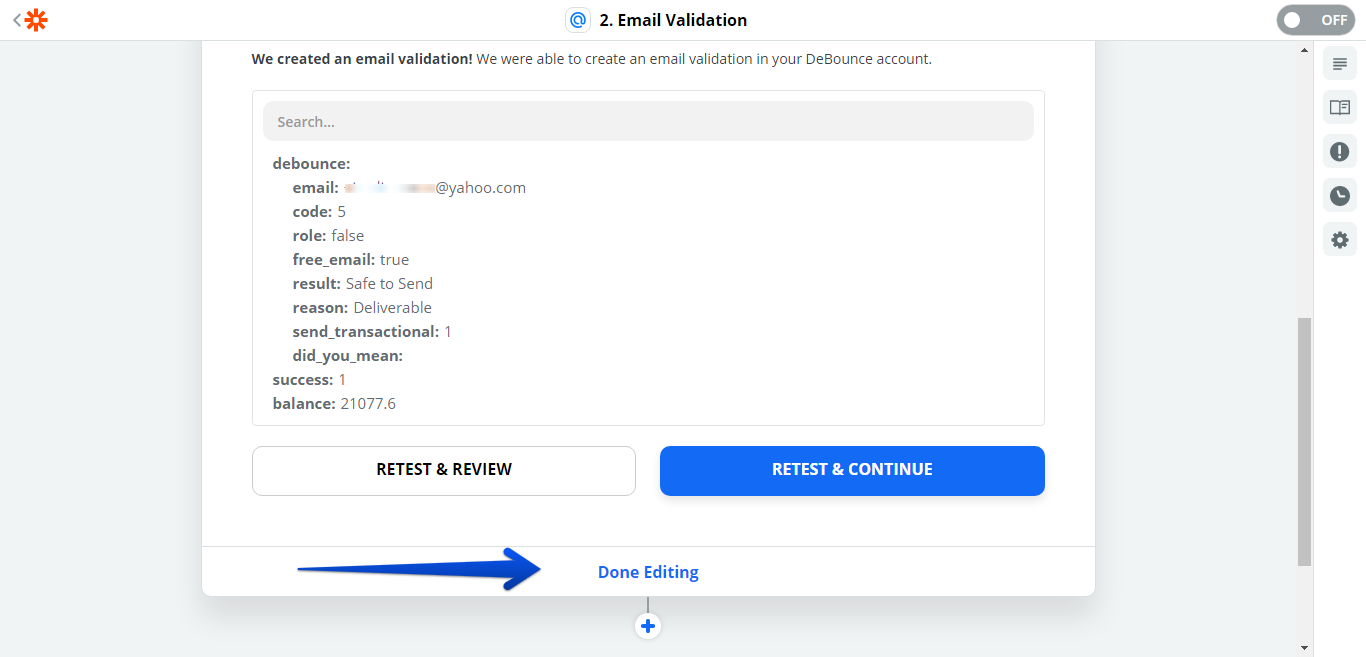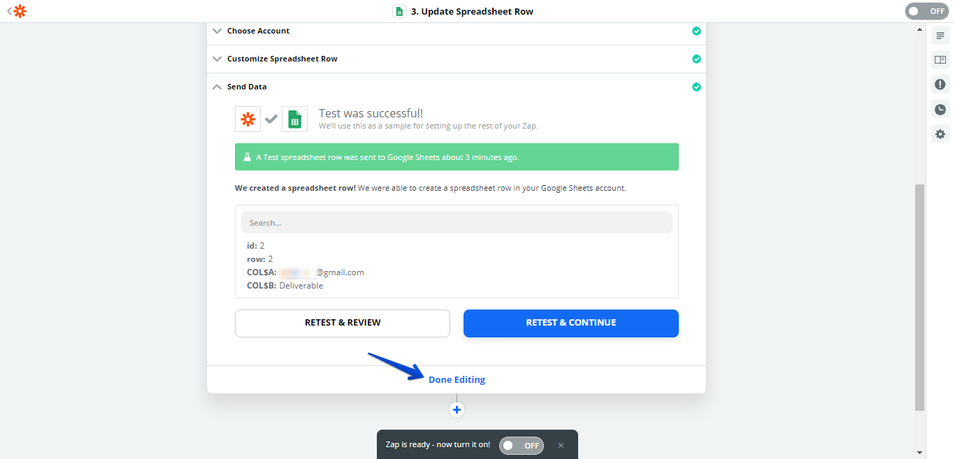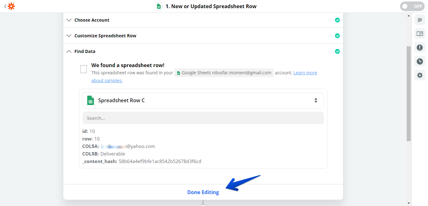 Step 18: Now, perform a manual test to ensure that everything is in place. Visit your spreadsheet and insert a new entry into your Email column. Navigate to your Zapier Dashboard and check to see your present Zap(s). Tap the drop-down menu close to the “ON” button. If no error pops up, then your Zap is working as planned. Now, return to your spreadsheet. By now, the verification results should have been synced back to the intended column and row; check to find out.