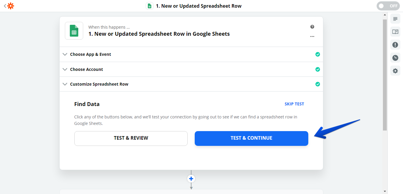 Step 7: On Find Data section, click on “TEST & CONTINUE”. A summary of the trigger setup will be displayed. Peruse the details to see if everything is correct. Then, click “Done Editing.” Action section will pop up if every detail is in order. Otherwise, an error message will be displayed. In such a case, recheck the settings from the past steps, make the necessary corrections, then perform the test again. Now that the setup is correct, choose “Continue.”