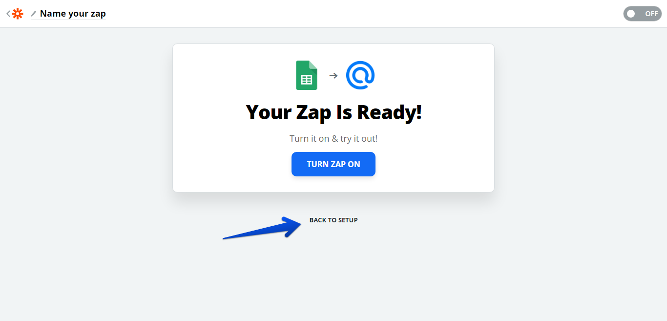 Step 12: The system will ask if you are willing to activate your Zap. Here, we are not ready because we need to engage one more step before our Zap becomes operational. The stage is to return the verification outcomes to the Google Sheet. So click on “BACK TO SETUP” and then move your cursor to the bottom, then tap “+” icon to include a new Action step.
