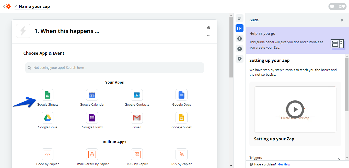 Step 3: Now, we will establish the Trigger, and Google Sheets will do the execution. On the “Choose app & event” section click on “Google Sheets”. If not, in the “Search Hundreds of apps” field, type Google Sheets. Once the app comes up on the list, select it.