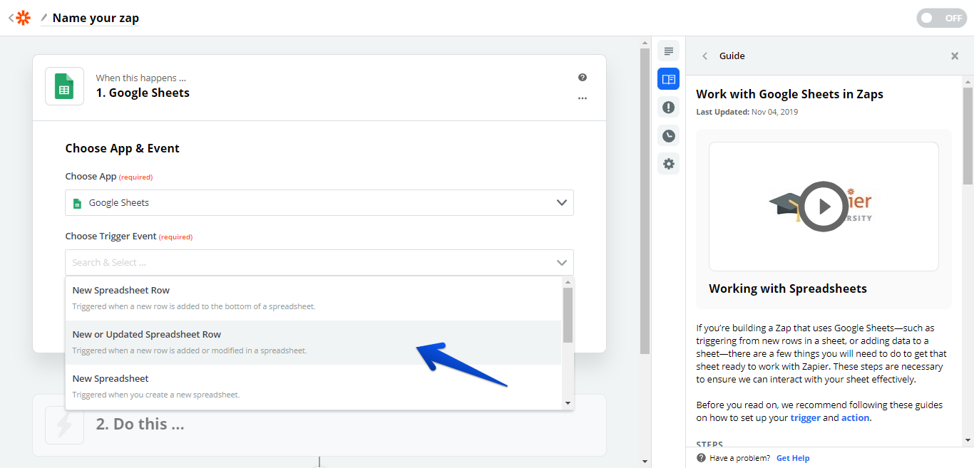 Step 4: The next thing is to inform the app about what we will like to trigger. Here, we aim to make the app trigger the Action whenever the spreadsheet is updated. Hence, select New or Updated Spreadsheet Row, then tap “Continue.”