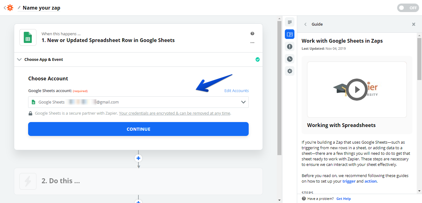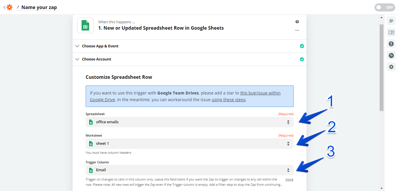 Step 6: Choose the specific spreadsheet file which you want to link. Select the drop-down icon beside the spreadsheet space, then click on the preferred spreadsheet. The system will display all the spreadsheet files which you have stored in Google Drive automatically. Afterward, choose the worksheet which you want the system to access, using the same process. Now, in your spreadsheet, choose the column which consists of the email addresses – check under the Trigger column. Then, tap “Continue.”